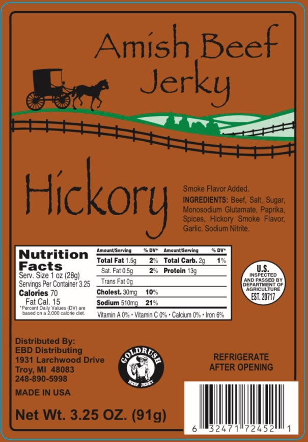Experience the rich, authentic flavor of Amish Hickory Beef Jerky, crafted from 100% premium beef sourced and produced in America. This artisanal jerky is hickory flavored, delivering a savory taste that is both tender and satisfying. Perfect for on-the-go snacking or as a protein-packed addition to your meals, this jerky embodies quality and tradition in every bite. Enjoy a wholesome snack that reflects the dedication and craftsmanship of Amish culinary heritage.