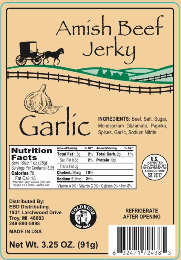 Experience the rich, savory flavor of Amish Garlic Beef Jerky, crafted from 100% premium American beef. This artisanal jerky is seasoned with a perfect blend of garlic and spices, delivering a robust taste that satisfies even the most discerning palates. Each piece is meticulously prepared to ensure a tender yet chewy texture, making it an ideal snack for any occasion. Enjoy the wholesome goodness of this traditional American treat, perfect for outdoor adventures or as a flavorful addition to your pantry.