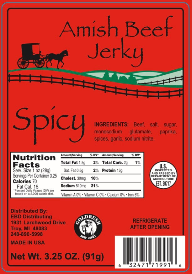 Experience the bold flavors of Amish Spicy Beef Jerky, crafted from 100% premium American beef. This artisanal jerky is seasoned with a unique blend of spices, delivering a perfect balance of heat and savory taste. Ideal for snacking on the go or as a flavorful addition to any meal, this jerky embodies quality and tradition in every bite. Enjoy a satisfying and protein-rich treat that reflects the craftsmanship of Amish culinary heritage.