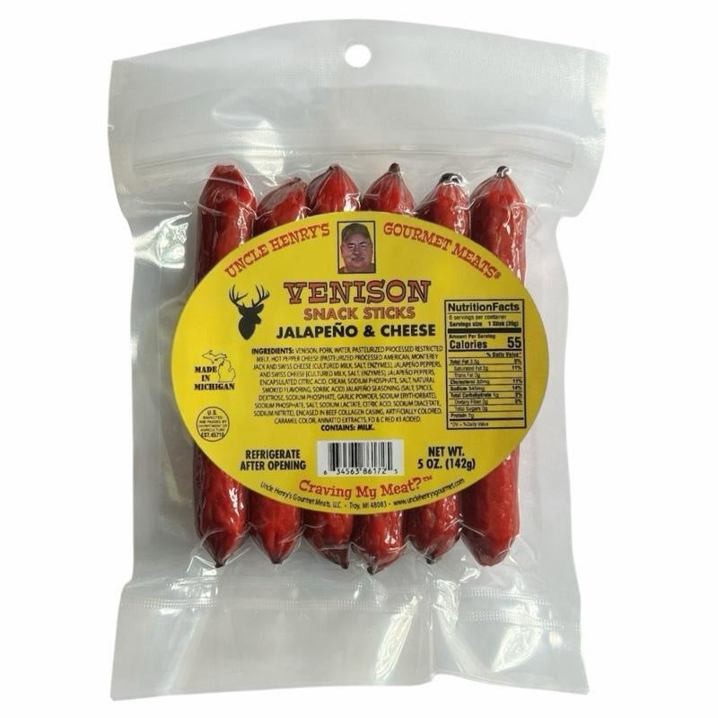 Venison Jalapeno and Cheese Snack Sticks: Crafted with the finest cuts of venison, these snack sticks are a savory delight for any occasion. Blended with just the right amount of jalapeno for a subtle kick of heat and infused with rich, creamy cheese, each bite is bursting with flavor. With minimal pork added for texture and moisture, these snack sticks offer a perfect balance of lean venison and succulent pork.